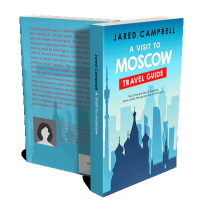“A book cover titled "A Visit to Moscow Travel Guide" with a silhouette of Moscow's architecture against a blue gradient background.”