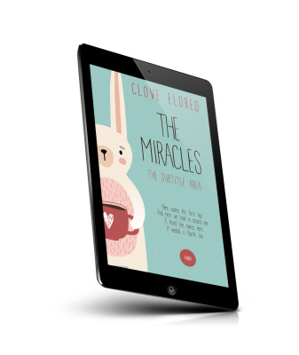 “Cover of a book with an illustrated rabbit holding a coffee cup on a teal background with small dots.”
