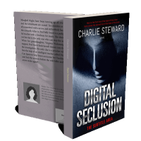 “A dark, shadowy cover with a mysterious face, the title "Digital Seclusion" in bold, metallic letters.”