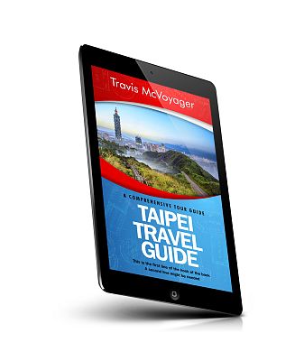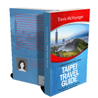 “A travel guidebook cover with a scenic view of Taipei, including its skyline, mountains, and a prominent landmark tower.”