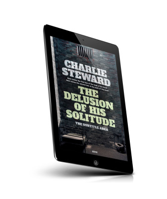 “A dimly lit room with a barred window, featuring a chair, table, and a cover design for "The Delusion of His Solitude."”