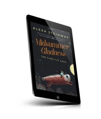 “Two children ride a large fish underwater at night with a full moon in the background.”