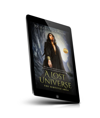 “A mystical figure in a long cloak stands against a swirling, cosmic background.”
