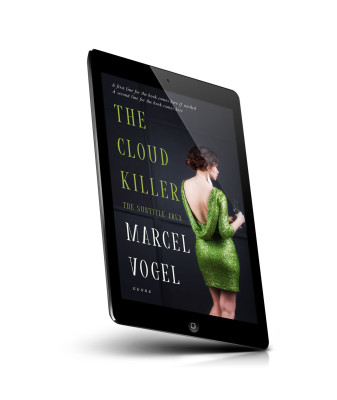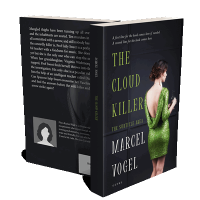 “A woman in a green sequined dress with an open back holds a glass. The background is dark with text about a book called "The Cloud Killer."”