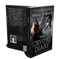 “A bearded wizard with a hood extends his hand dramatically. The title "The Crying Diary" is prominently displayed below.”