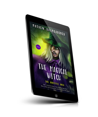 “A green-skinned witch with a long nose and purple coat is set against an eerie greenish background.”