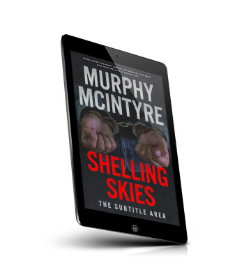 “A cover shows a person in handcuffs with the title "Shelling Skies" in bold red text.”