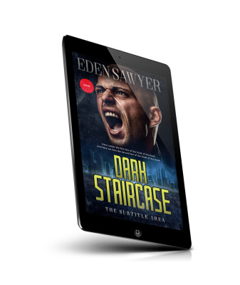 “A man with an intense expression and shaved head against a dark, urban backdrop with the title "Dark Staircase."”
