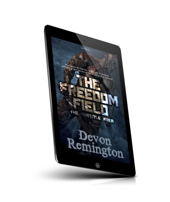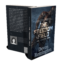“A muscular figure with a metal arm stands against a dark backdrop. The title "The Freedom Field" dominates the center. Authored by Devon Remington.”