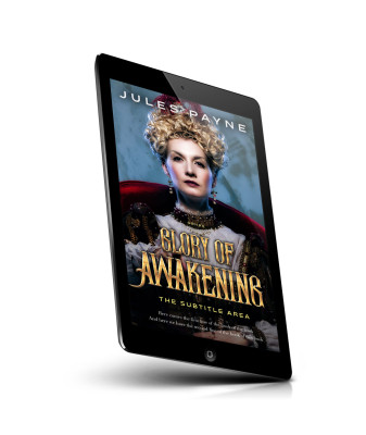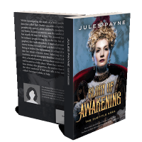 “A regal woman in a historical costume sits against a dramatic, cloudy backdrop.”