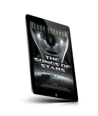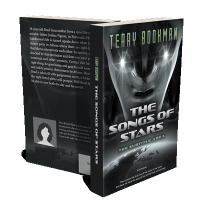 “A sci-fi book cover featuring a mysterious face emerging from a starry sky above a planet. Bold title in the center.”