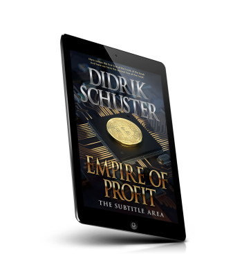“A gold Bitcoin rests on a computer chip, representing digital currency and technology. Book cover design with an author's name and title.”