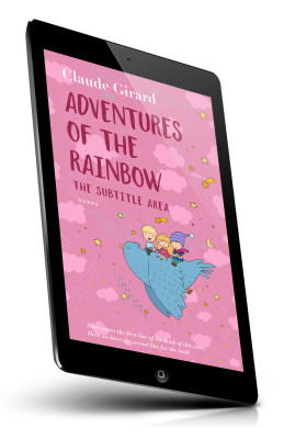 “Three children riding a large blue bird in a whimsical, pink, star-filled sky.”