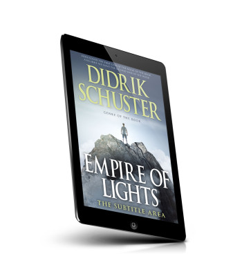 “A person stands atop a rocky peak, surrounded by clouds, underneath the title "Empire of Lights."”