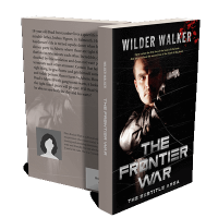 “A man in a dark setting wearing leather gloves, positioned under a title "The Frontier War" with a rugged, intense expression.”