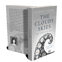 “Clocks form a swirling pattern against a cloudy backdrop with two small figures at the bottom.”