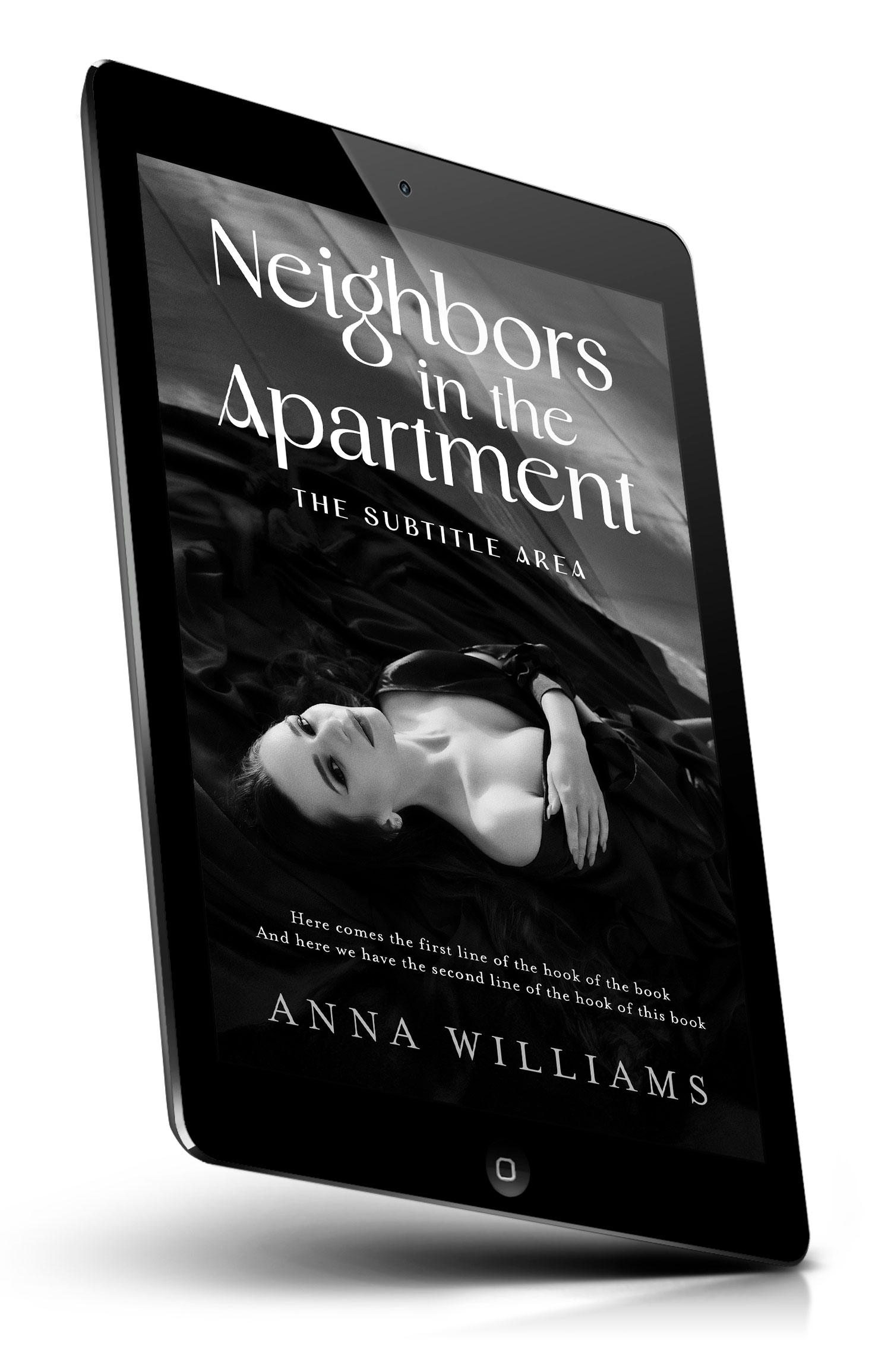 Tags: noir, black and white, thriller, suspense, mystery, romance, femme fatale, dramatic lighting, moody, glamour, lingerie, reclining woman, seduction, intimate, urban, apartment building, shadows, elegant, cinematic, dark tone