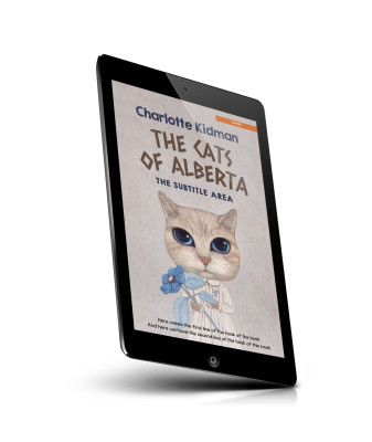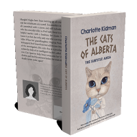 “An illustrated cover featuring a cat holding a blue flower, titled "The Cats of Alberta" with prominent text and a genre tag.”