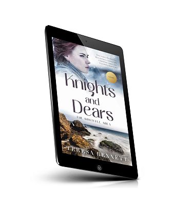 “A woman gazes into the distance, behind text that reads "Knights and Dears." The background features rocky shores and a misty ocean scene.”