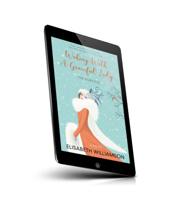“Elegant woman in vintage attire with a white fur stole and hat, set against a snowy, teal background with a small bird and tree branch.”