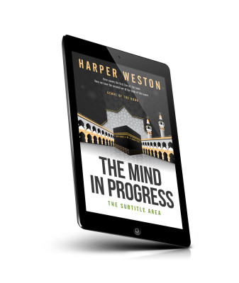 “A book cover featuring a mosque, minarets, and a central black and gold structure with an abstract background. Title: "The Mind in Progress."”