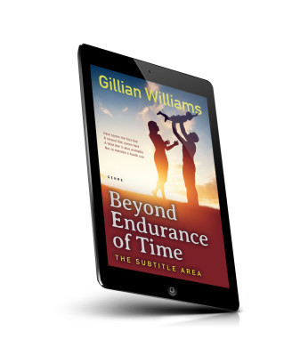“A family silhouette at sunset with a man lifting a child in the air and a woman nearby. Title: "Beyond Endurance of Time."”