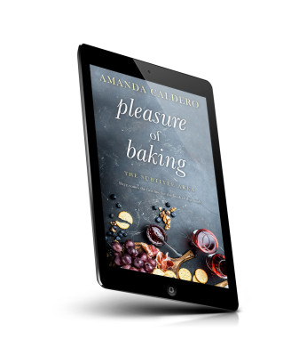 “A book cover with a dark background, snacks, wine, and the title "Pleasure of Baking".”