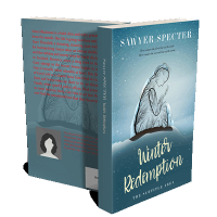 “An illustration of a person in a winter landscape with icy blue tones, surrounded by snowflakes, and mountainous scenery.”