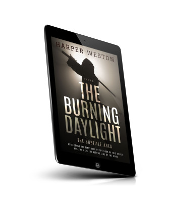 “A shadowy figure holds a weapon against a bright, foggy background. The title "The Burning Daylight" is prominently displayed.”