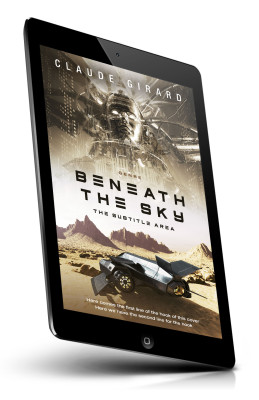 “A futuristic book cover with a sci-fi theme, depicting a robot face and a futuristic vehicle in a desert landscape.”