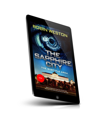 “A sci-fi book cover shows futuristic elements above a grand illuminated building under a dark sky, suggesting an intriguing plot.”