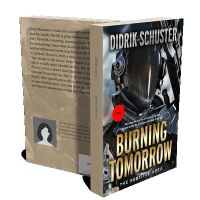 “An astronaut in a space suit appears on the cover, with a red circle labeled "Genre" and the title "Burning Tomorrow" in bold.”