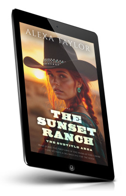 “A woman with red hair in a cowboy hat and turquoise earrings stands against a sunset background.”