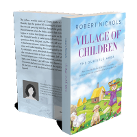 “Colorful cover showing a cheerful village with sheep, a cottage, and a scarecrow in a field.”