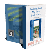 “Two children holding hands walk down a path surrounded by greenery, framed by an open blue window.”