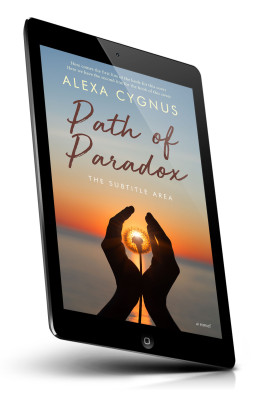 “Silhouetted hands holding a dandelion against a sunset background. Book titled "Path of Paradox" by Alexa Cygnus.”