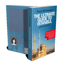 “The image features a book cover titled "The Ultimate Guide to Istanbul" with an illustration of a mosque and minarets against a blue sky background.”