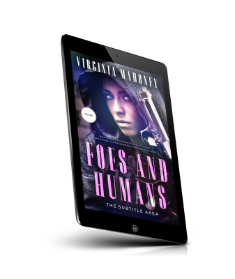 “Woman in hood holding gun, intense look, vibrant purple and pink font, book cover design.”