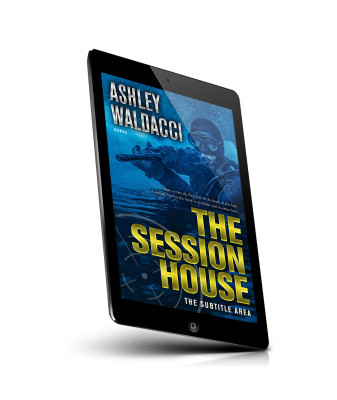 “A diver with a gun emerges from water, wearing scuba gear. The background is blue-toned with bold yellow title text below.”