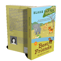 “An elephant, cheetah, tiger, and monkey stand under a tree by a river on a colorful book cover titled "Best Friends."”