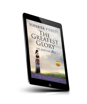 “A woman in a long dress holds a violin in a grassy field under a cloudy sky, with book title and author text above her.”