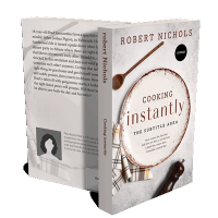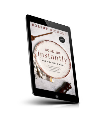 “A cookbook with a rustic setting featuring a plate, wooden spoon, pepper grinder, and checked cloth.”