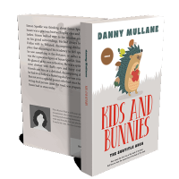 “A cheerful hedgehog holding an apple, surrounded by mushrooms and leaves, with the book title "Kids and Bunnies" in red text below.”