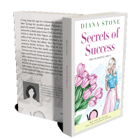 “A book cover featuring a woman with blonde hair in a blue shirt and pink skirt, standing next to pink flowers.”