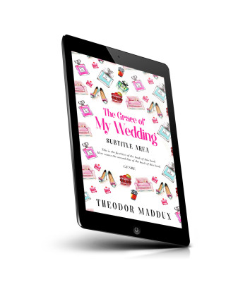 “An illustration featuring wedding-themed items like dresses, cakes, and perfume bottles, with a title and author's name prominently displayed.”