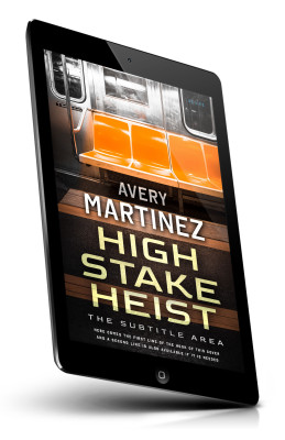 “An empty orange subway seat in a metallic carriage with a wooden floor below text featuring an author’s name and a book title.”