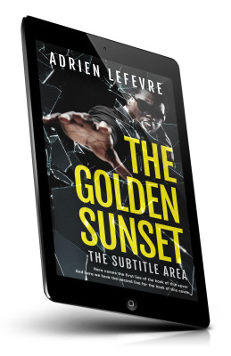 “A man in sunglasses reaches out as shattered glass surrounds him with the text "THE GOLDEN SUNSET" in bold yellow letters.”