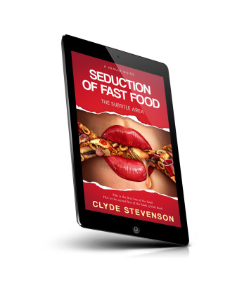 “Cover with lips holding fast food, red background, and highlighted title.”