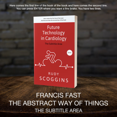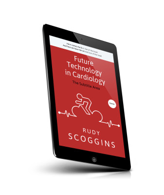 “A red book cover with a cyclist illustration, heart rate line, and text about future technology in cardiology by Rudy Scoggins.”