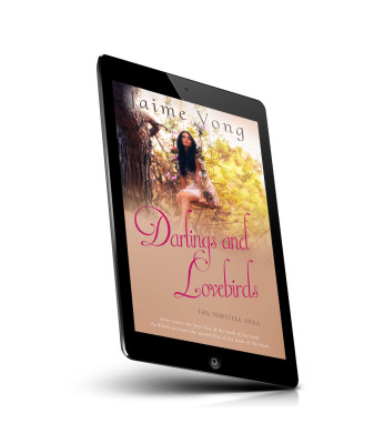“A woman in a white dress on a flower-adorned swing, set against a sunlit natural background, with "Darlings and Lovebirds" in pink font.”
